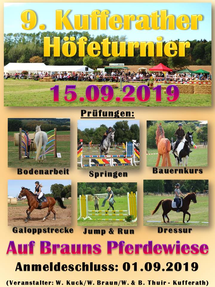 Zusammen mit den beiden befreundeten Höfen Kuck und Braun aus Kufferath richten wir jedes Jahr im September ein gemeinsames Breitensportturnier aus. Das Kufferather Höfeturnier. Dort bieten wir verschiedene Wettbewerbe wie die Bodenarbeit (geführter Geschicklichkeitswettbewerb), den Bauernkurs (gerittener Geschicklichkeitswettbewerb), einen Dressurwettbewerb, einen kleinen Springwettbewerb und eine Galoppstrecke durch das Maisfeld an. Die genauen Wettbewerbe entnehmen Sie bitte der jeweiligen Ausschreibung.